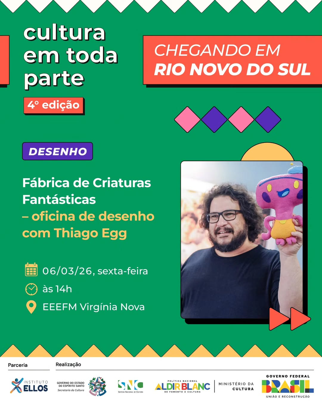 Amanhã dou uma oficina de desenho em Rio Novo do Sul aqui no interior do ES em mais uma edição do Cultura em toda parte promovido pela Secult-ES. Participei com minha Máquina de desenho lá na Praia Grande em Fundão recentemente. Foi demais! Tem fotos aqui.